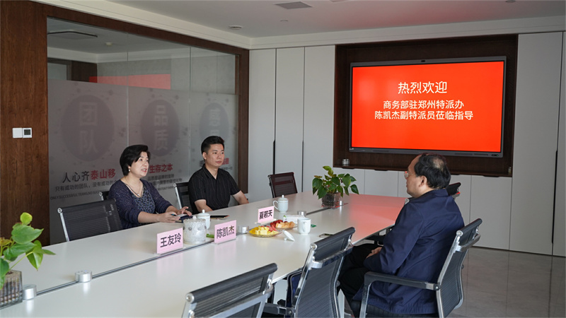 2022年9月29日上午,商務(wù)部駐鄭州特派員辦事處副特派員陳凱杰蒞臨鄭州天天會(huì)展服務(wù)有限公司(以下簡(jiǎn)稱:天天公司)調(diào)研指導(dǎo)工作,天天公司董事長(zhǎng)王友玲,副董事長(zhǎng)夏若天進(jìn)行了接待。